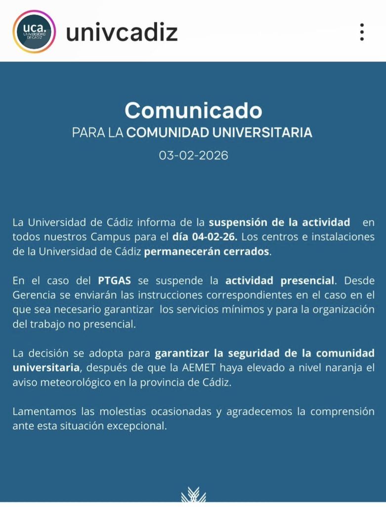 Ante la previsión del tiempo meteorológico para el miércoles 4 de febrero de 2026, se trasladan los exámenes previstos para el día 4 al jueves 5 de febrero, en horario y lugar previsto en el documento que se anexa EXAMENES FEBRERO 2026 CAMBIOS POR ALERTA.